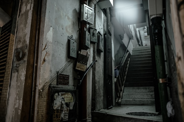 Junto a las señales del abandono —cristales rotos, persianas descabalgadas, antiguos anuncios de alquiler—, se distinguen carteles de oficinas aún en funcionamiento: un bufete de abogados, dos auditorías, dos asesorías fiscales, una academia de idiomas.